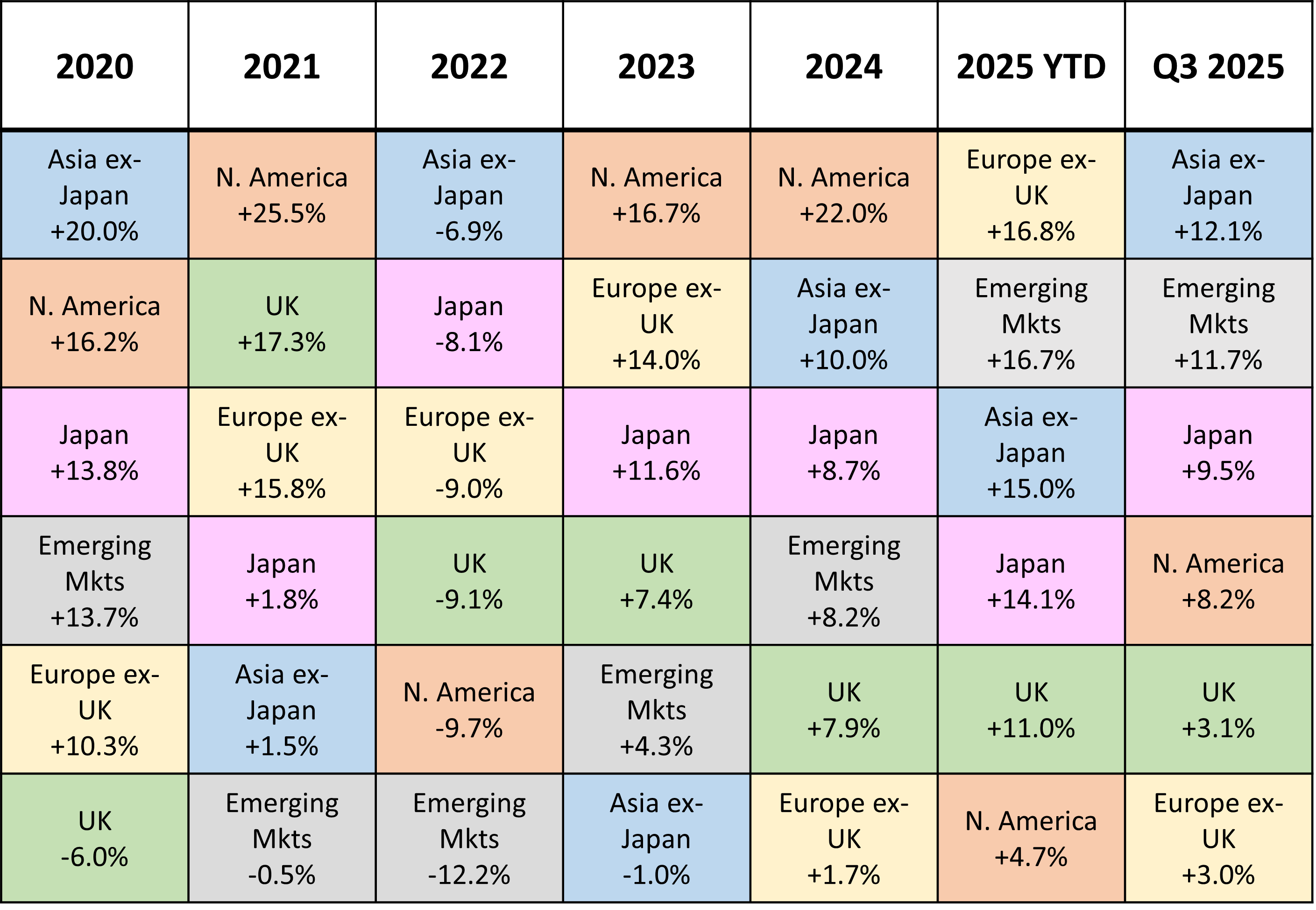 Major market total returns in Sterling. Data correct as of 30/09/25. Sectors used: Asia ex-Japan – IA Asia Pacific ex-Japan TR (GBP), Emerging Mkts – IA Global Emerging Markets TR (GBP), Europe ex-UK – IA Europe excluding UK TR (GBP), Japan – IA Japan TR (GBP), N. America – IA North America TR (GBP), UK – IA UK All Companies TR (GBP).